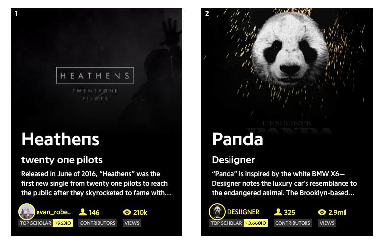 "Heathens" has unseated "Panda," which is no mean feat, and we're getting a ton of new people killing it with suggestions and analysis on that song.